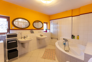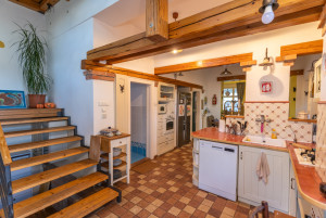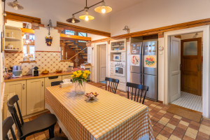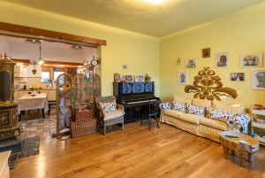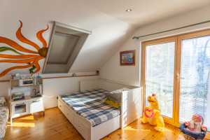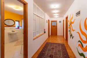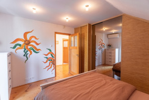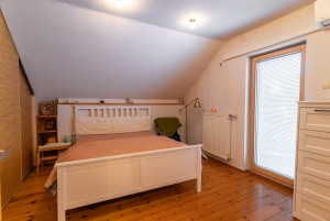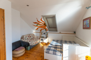 A téglaépítésű, jó állapotú ház a 80-as években épült, 2005-ben korszerűsítésen esett át. A nappali, étkező és konyha egy légtérben található, nagy ablakfelületekkel és közvetlen kertkapcsolattal. A földszinten található továbbá egy különálló hálószoba saját fürdővel, valamint külön WC. Az emeleten három hálószoba (az egyik erkélyes), nagy sarokkádas fürdőszoba, külön WC és gardróbszoba kapott helyet.